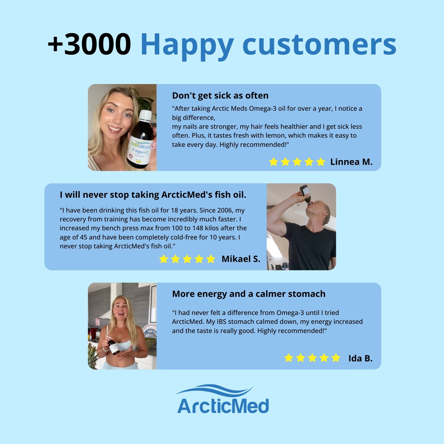 "I have been drinking this fish oil for 18 years. Since 2006, my recovery from training has become incredibly much faster. I increased my bench press max from 100 to 148 kilos after the age of 45 and have been completely cold-free for 10 years. I never stop taking ArcticMed's fish oil."