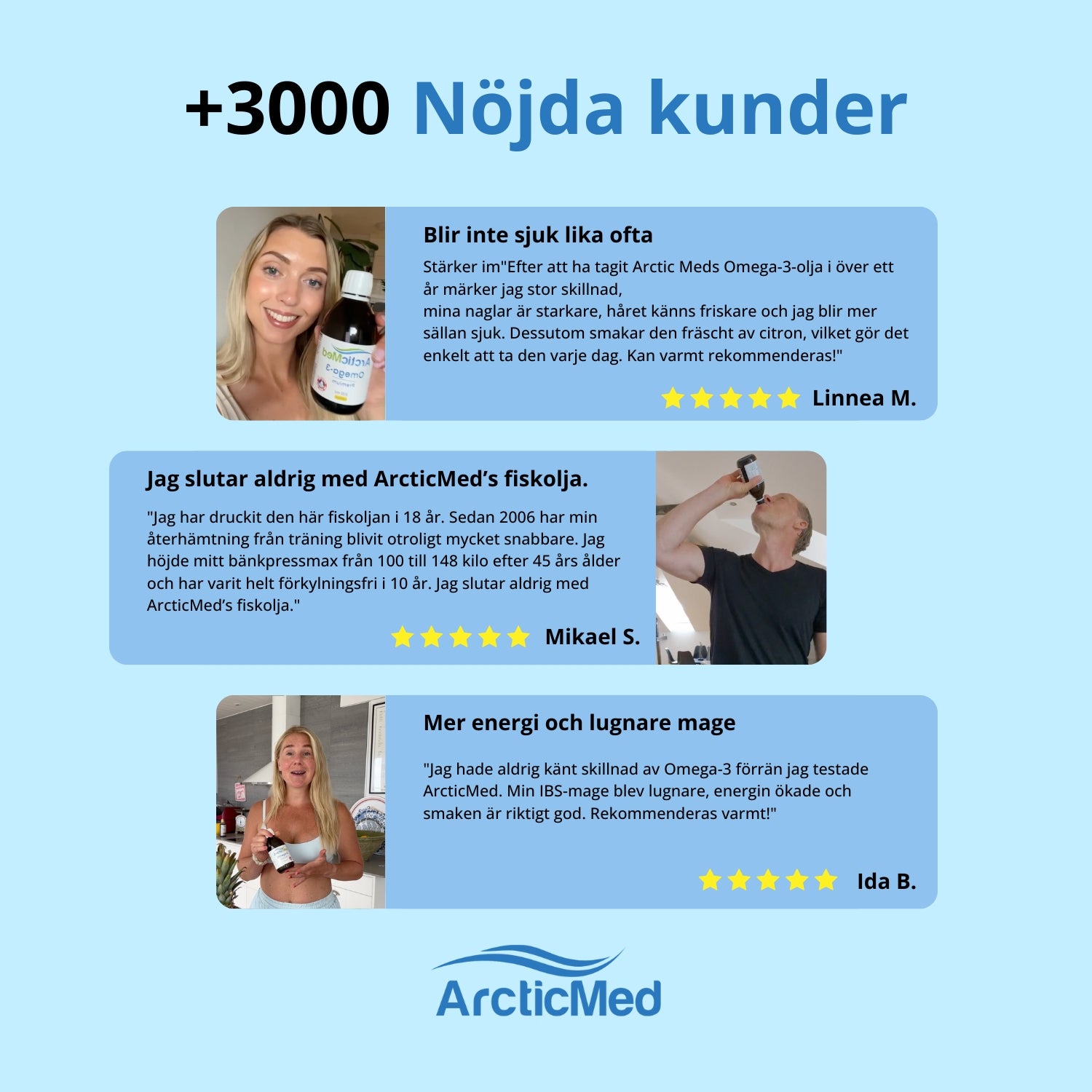 "Vi har ätit ArcticMed olja under rätt många år. Och vi tycker att oljan är av hög kvalitet, upplever att den 'smörjer' tarmkanalen o känns bra för hjärta o kärl. Ger energi! Seriöst företag vilket är svårt idag med en enorm uppsjö av alternativ."